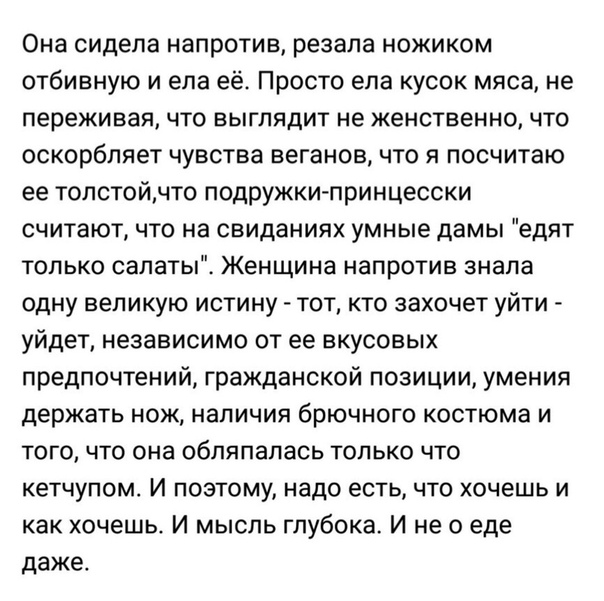 3a столиком кафе сидел парень, в котором умер великий спортсмен, потому что он слишком много пил, и поэтому он стал сторожем на складе. Парень разговаривал с девушкой, в которой умерла гениальная актриса, потому что в театральный можно поступить только по знакомству, и теперь девушка работала бухгалтером.Показать полностью…За кассой сидела женщина, в которой умерла знаменитая балерина, потому что с такой фигурой в группу не берут, и вообще, надо было, уважаемая, 10 лет назад приходить.Прошел с подносом официант, в котором умер великий писатель, потому что никто не хотел издавать его рукописи, таких писак навалом, сейчас все пишут.Мимо по улице прошла мама с ребенком, в котором уже начал умирать гениальный музыкант, потому что родители отдали его в лицей с финансовым уклоном, а учительницу музыки, которая их просила не загубить талант мальчика, послали подальше. В маме умерла известная художница, потому что она слишком рано выскочила замуж, родила и посвятила себя семье.Пространство было наполнено призраками гениальных деятелей культуры, науки и искусства — великих членов общества, и реальными фигурами простых скучных смертных.Сверху за ними наблюдал некто, в ком умерло желание всех спасти. Он давно не понимал, почему одни спасаются сами, а другие гибнут, как их ни спасай. И теперь он просто смотрел на них, как смотрят телевизор, переключая с первого на сотый канал.